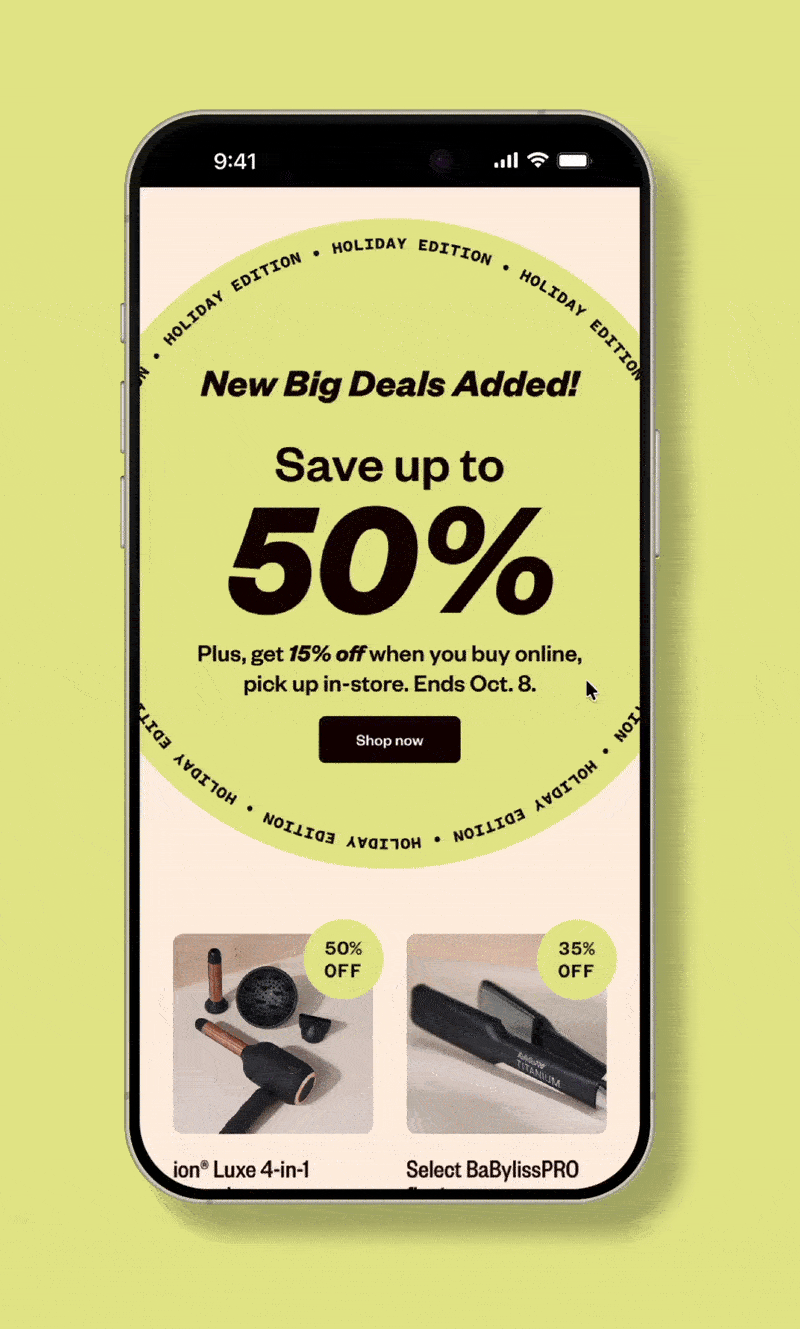 For October Big Deals, I worked with another designer on this omni-channel project, managing assets and ensuring cohesiveness across channels. This project included web billboards, Instagram and Facebook assets, Figma email design, paid social media, SMS and animated Sally Beauty app assets.